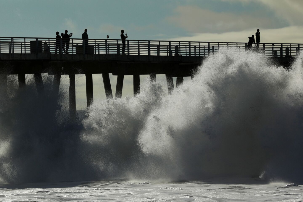 Forecasters are predicting waves between 20 and 25 feet on west-facing shores in Oregon and California, and several offshore buoys already have even more imposing crests. The same set of circumstances in Santa Cruz recently resulted in a partial wharf collapse that sent three people into the water. The National Weather Service warns that enormous waves can sweep onto beaches unexpectedly and carry away people on rocks, jetties, and beaches. Authorities say even experienced surfers are at risk when the ocean’s energy is this high.